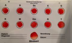 Die Testfolie wird anschließend sofort ausgewertet. Der Test ist positiv, wenn deutliche Verklumpungen zwischen Blut und Kolloid sichtbar werden (Antigen-Antikörperreaktion).